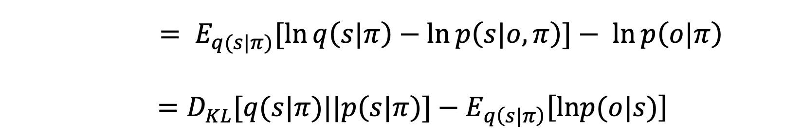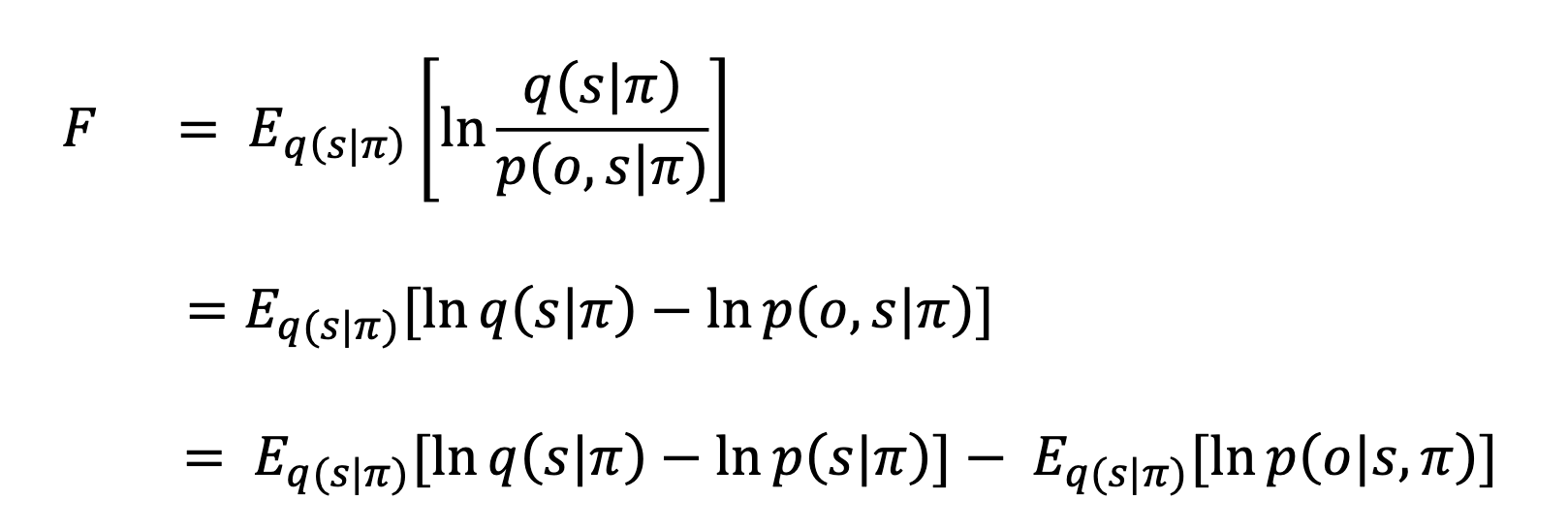 \mc{F} = \E_{s \sim p(s\mid o,\pi)}\left[\lg \frac{p(s\mid o,\pi)}{p(s,o\mid\pi)}\right] = \E_{s \sim p(s\mid o,\pi)}\left[\lg \frac{1}{p(o\mid \pi)}\right] = \lg \frac{1}{p(o\mid \pi)}