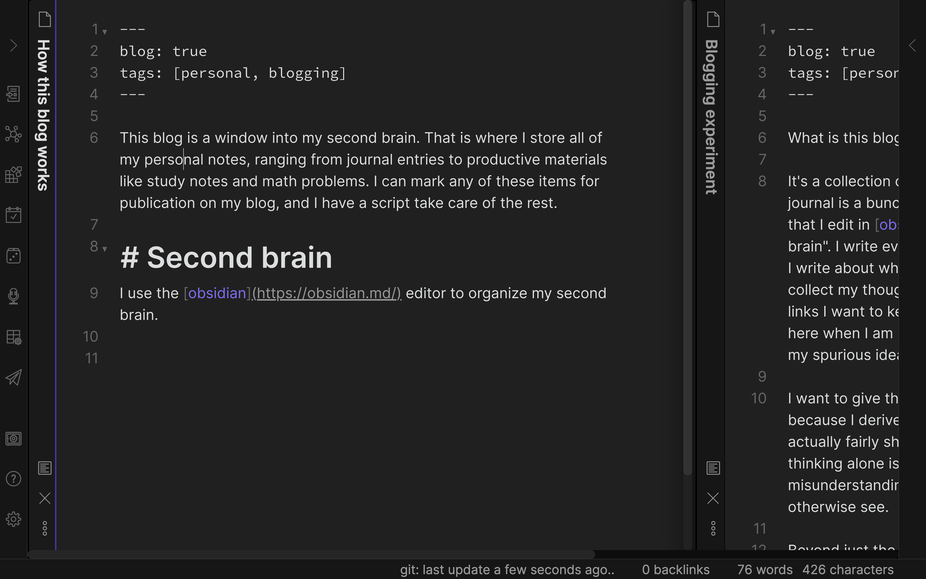 In any note in my second brain (Obsidian), I can set blog: true and that note will be published on my blog.
