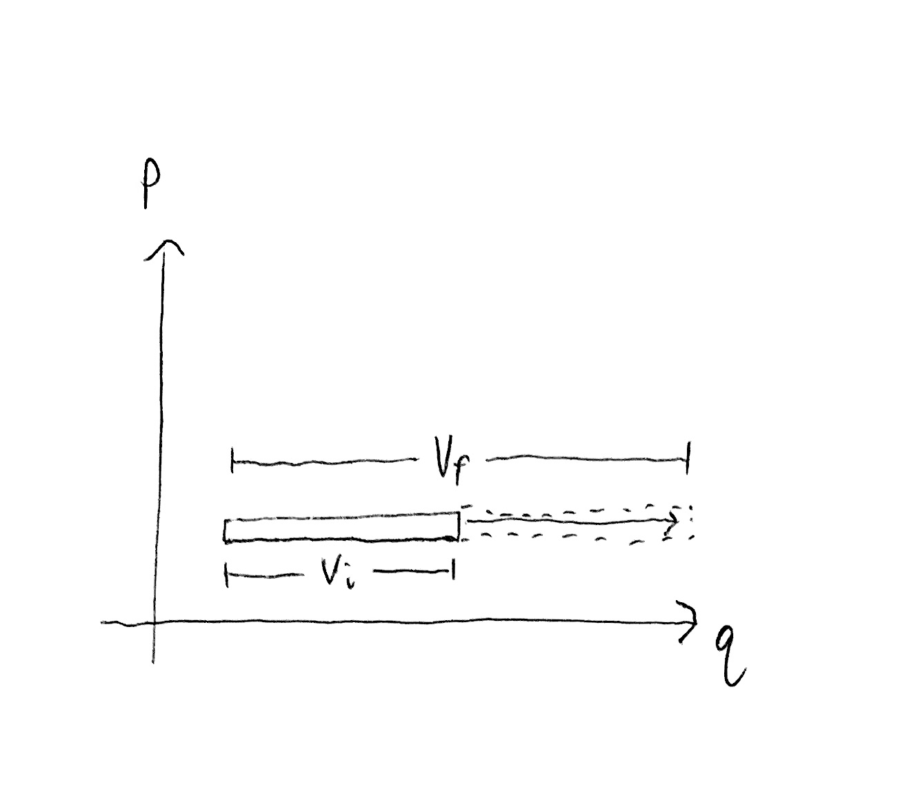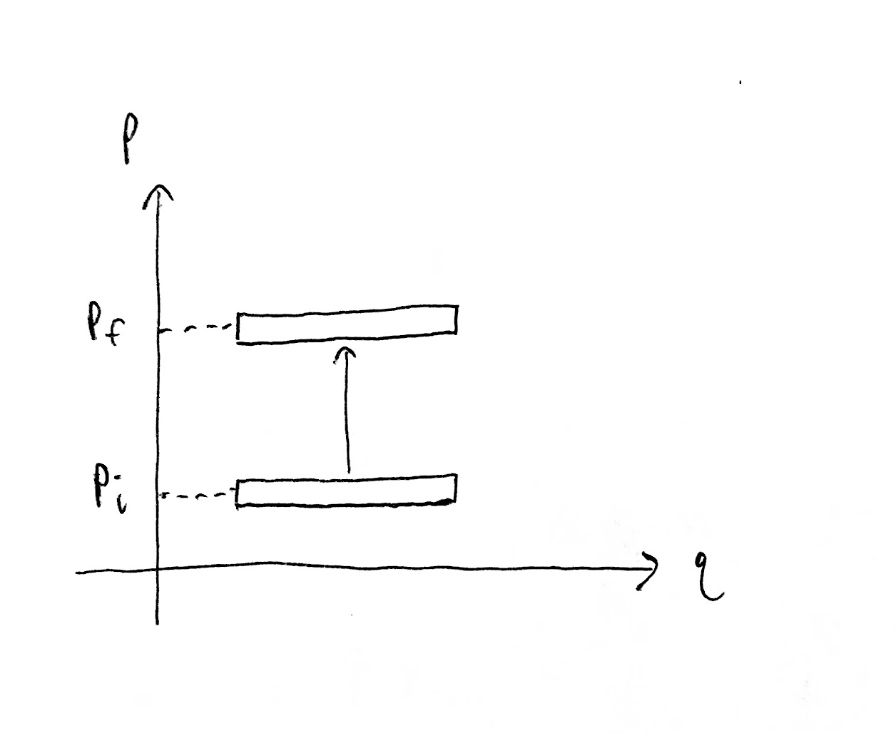 On the other hand, the temperature is proportional to the kinetic energy of each degree of freedom which is proportional to momentum squared. In other words, moving our state region up and down along a $p$ axis changes the temperature of the gas accordingly. But we are only translating the state region, rather than stretching or shrinking it, so how does the size of the state region change?