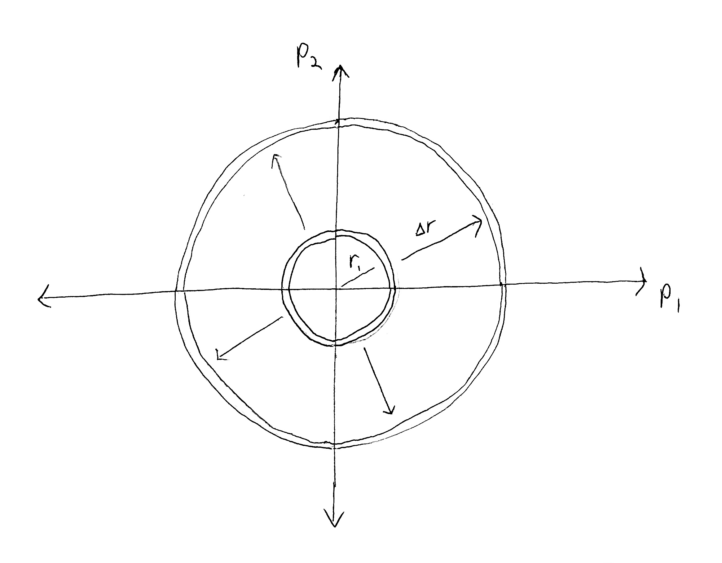 =\ & \frac{\pi^{\frac{n}{2}}}{\G\tup{\frac{n}{2}+1}}\par{2m}^{n/2}\left[\par{E+\e}^{n/2} - E^{n/2}\right]\,.