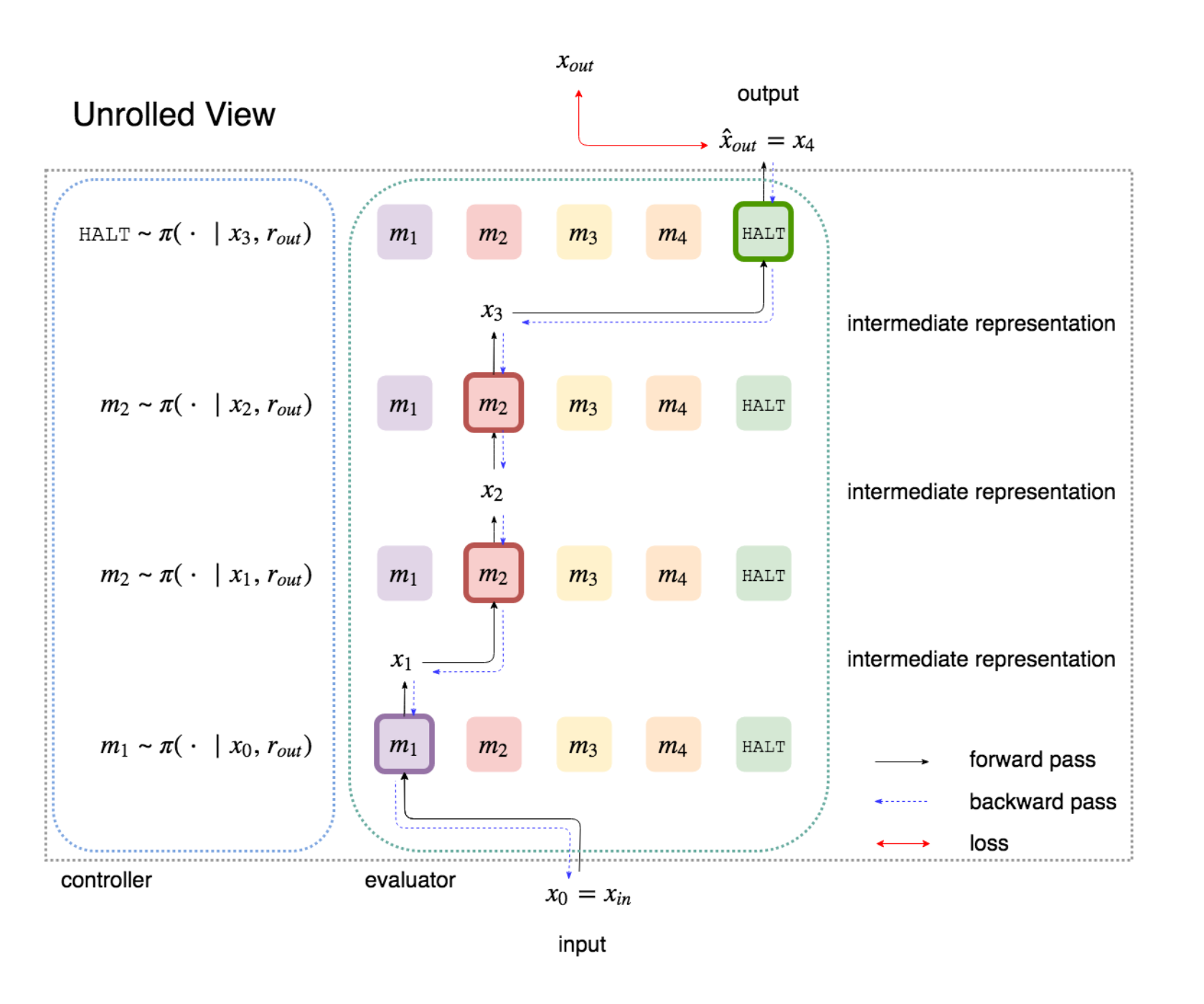 - A function $g$ that takes routing specification $a$, modules $\set{f_i}$, and input $x$, and outputs hidden representation $h$ (also a real vector).