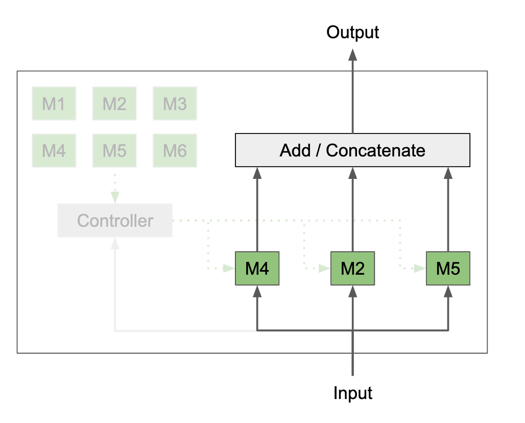 In Kirsch et al., the choices are organized into layers, where for each layer $l$ a subset of $M$ modules are selected and their outputs are summed. In Abolafia et al., modules are connected into arbitrary computation graphs.