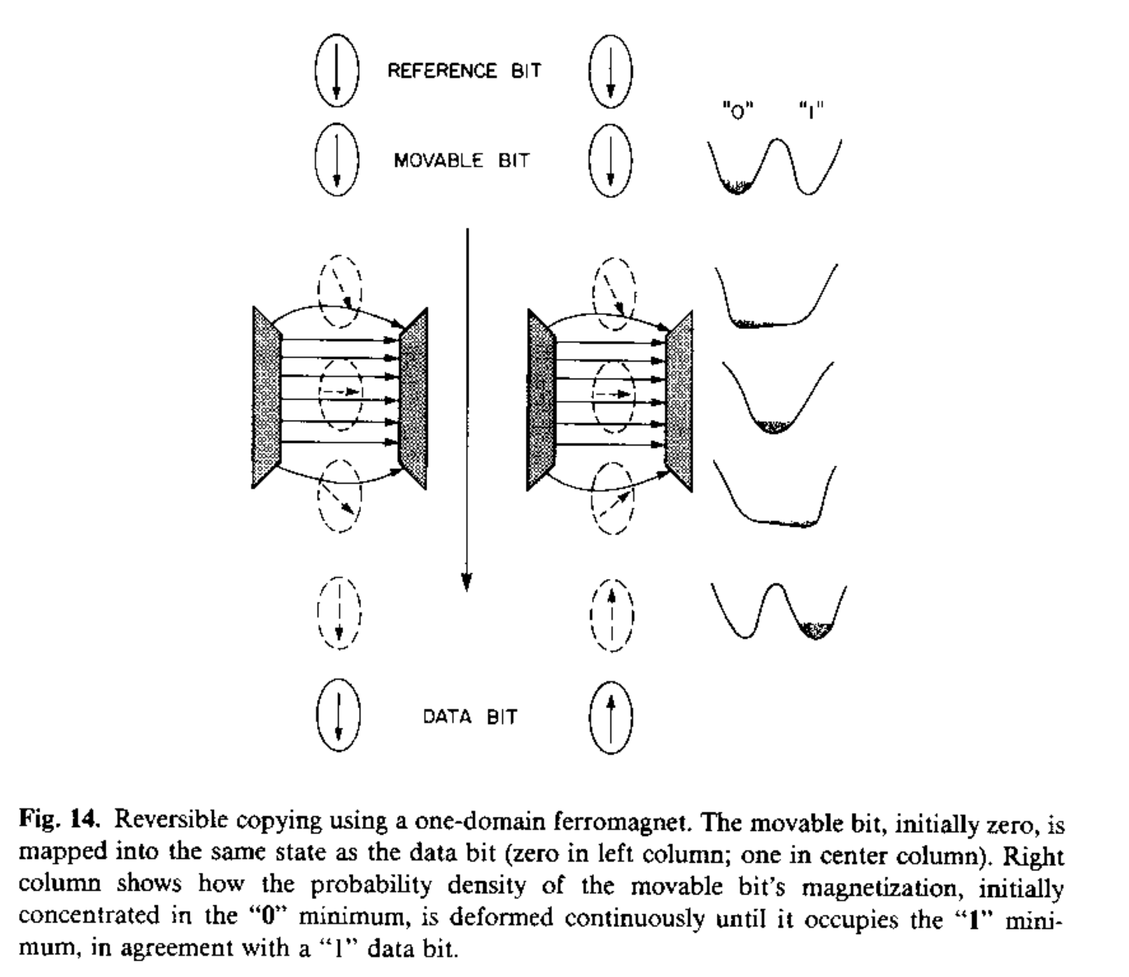 Also, if the reference bit and movable bits start out with opposite orientations, then as the potential field becomes lopsided, it will raise up the potential well the movable bit is occupying (which is opposite the one the reference bit is occupying). Lifting up a potential field under an object implies transfer of energy to that object (as potential energy). That is to say, we spend energy moving the movable bit through the sideways magnetic field. On the other hand, when the movable bit is in the “correct” well to start with, the bottom of that well remains at the same potential level through out the copy process, just moving sideways to the center and then to which ever well the data bit occupies.