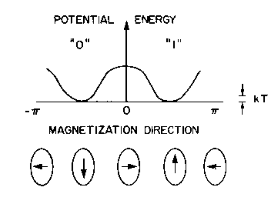 Bennett supposes that absent any external magnetic fields, the magent’s field direction is stable, as in it is stuck in the up or down position. This can be represented by a potential field as a function of the magent’s angle of rotation: