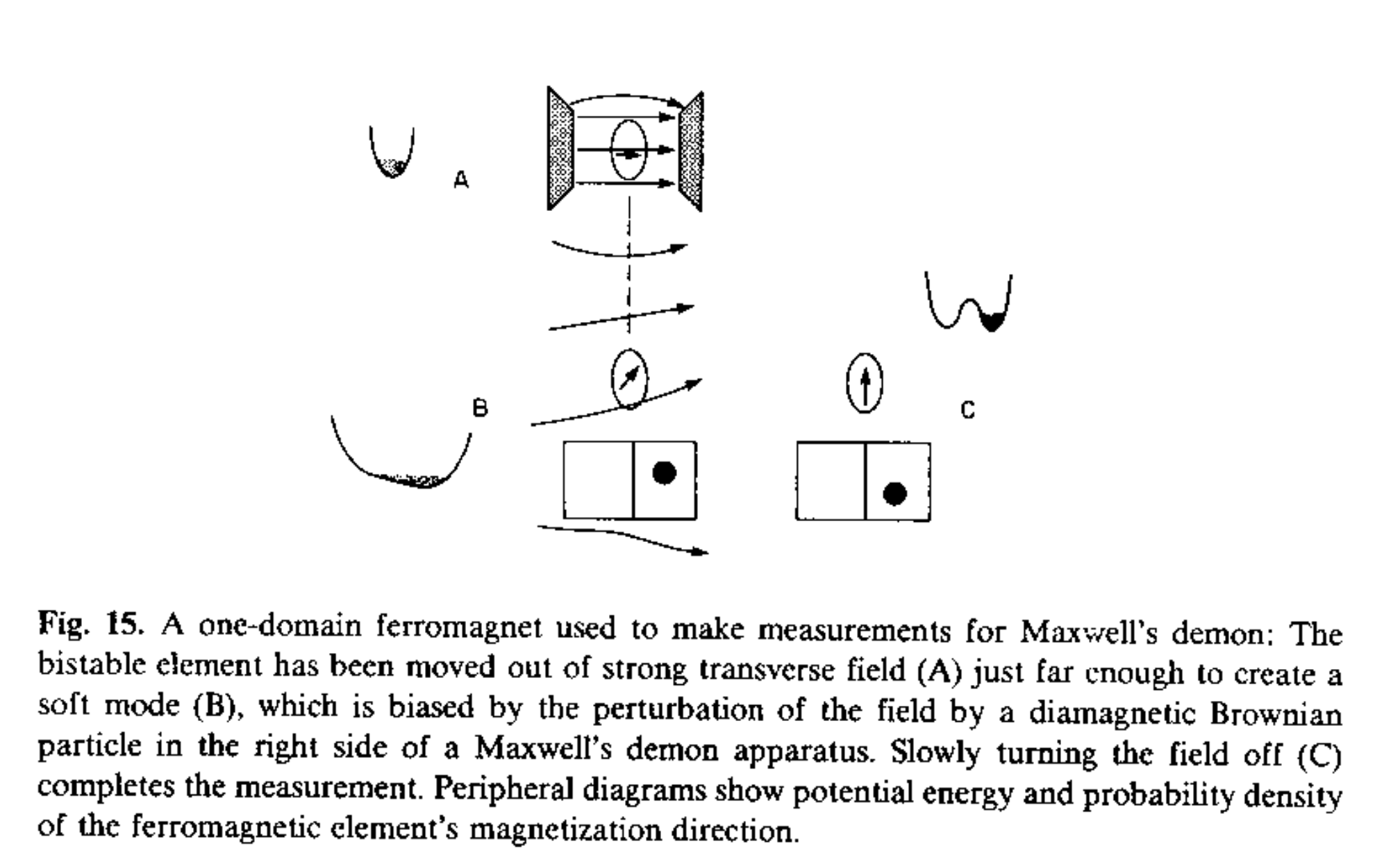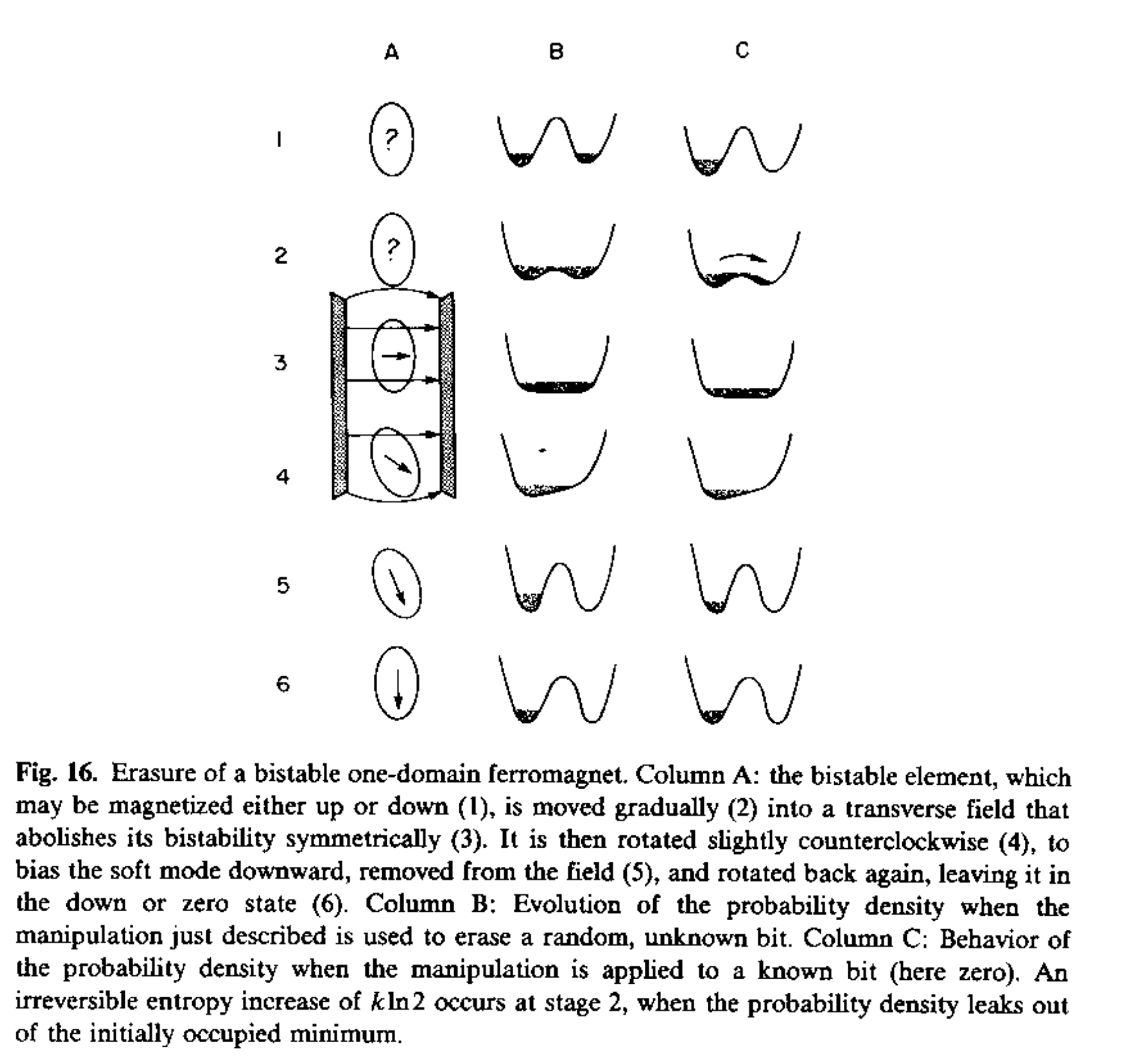Without the reference bit, the transition from two to one potential wells is symmetric, and the state region “spills over” the hump (timeline C below), causing our uncertainty about the magnet’s orientation to increase (corresponding to an entropy increase). This is an irreversible process.