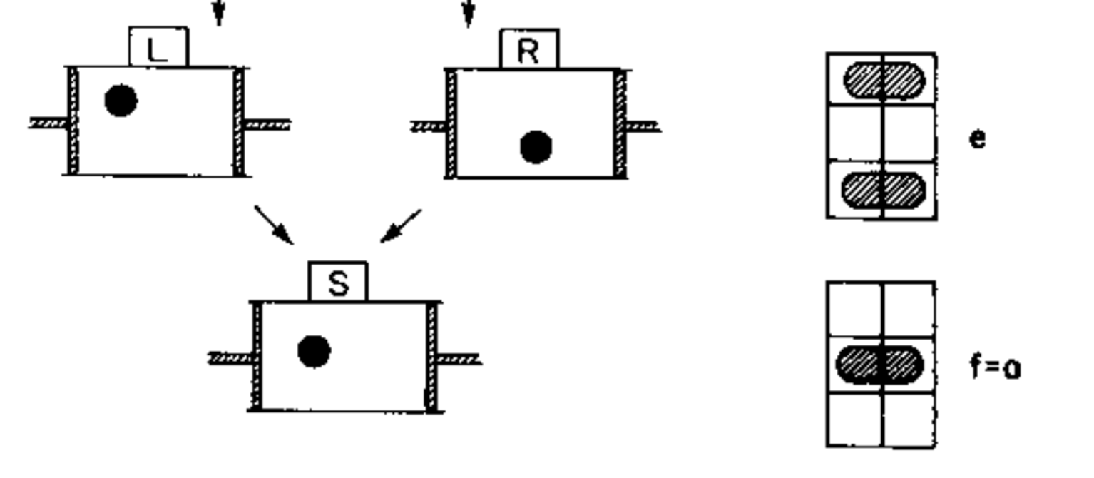 A measurement is taken which determines which section the particle is in. The measurement outcome is stored in a bit of physical memory depicted on the right. That bit is initialized in a known “standard” state S (what I previously called the default state). The measurement puts the bit into the left (L) or right (R) states, depending on which side of the box the particle occupies (from our perspective we don’t know which state the bit is in).