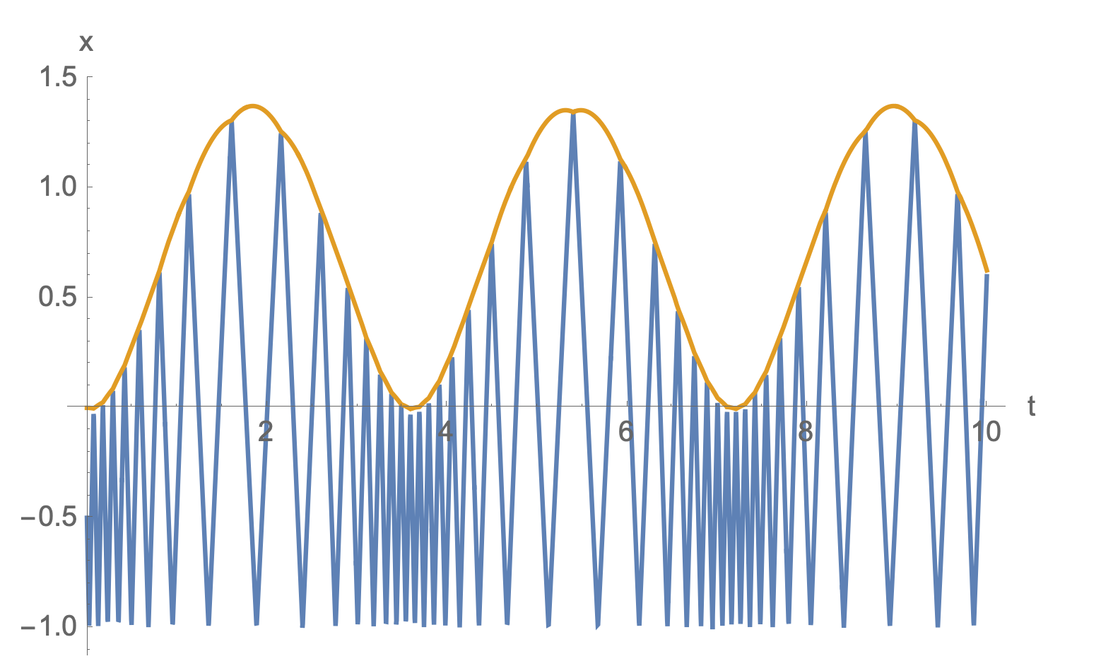 particle: (mass) $m = 1/10$ and (initial velocity) $v_0=5$