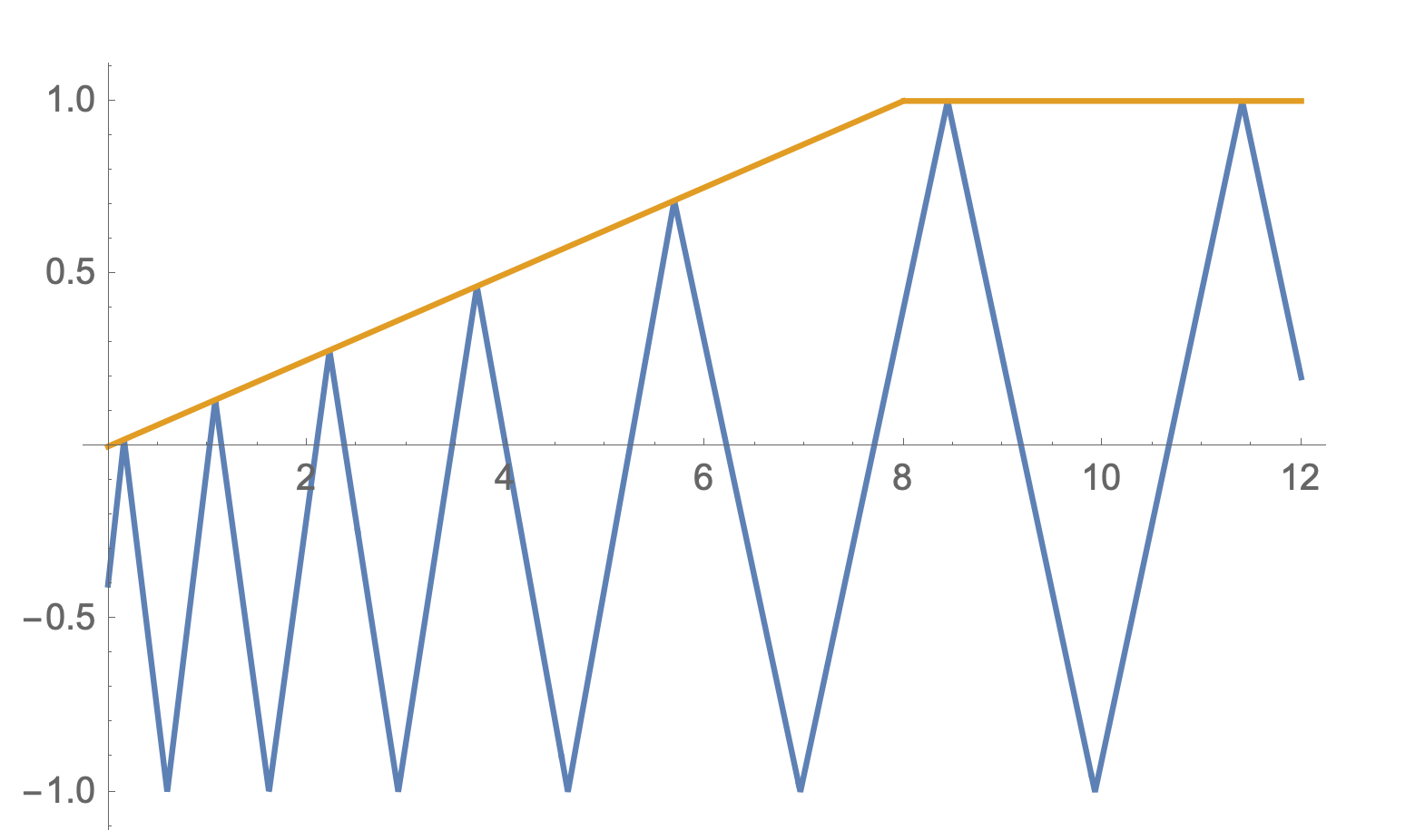 It seems that this too results in disjoint state regions, and so the which-side information is again preserved. What’s also apparent is that the state regions are shrinking. Liouville’s theorem guarantees that state volume will be conserved in a closed system. However, here there is energy being lost to the piston. If we plotted the joint state space of the particle and piston we would see that the total state region does not shrink.